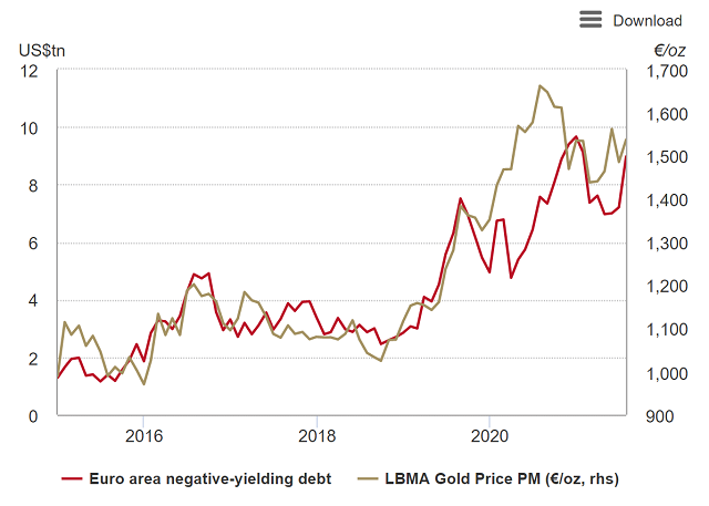 图2:黄金与欧元区负收益债务密切相关