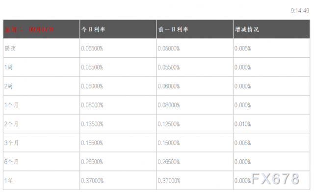 09月07日香港银行间同业拆借利率港币:隔夜报0.055% 1周期报0.055% 1月期报0.08% 3月期报0.155% 6月期报0.265%