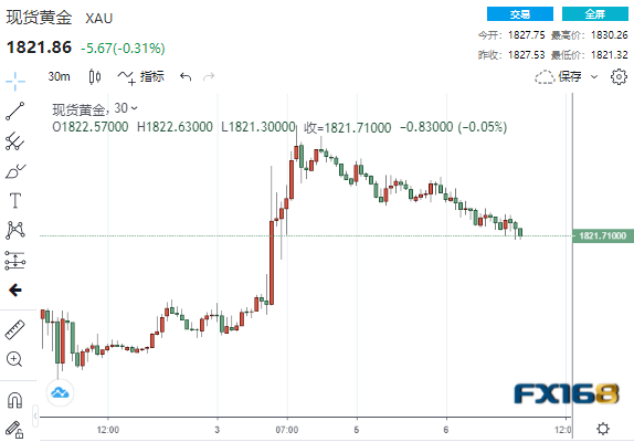 现货金稳定在1826.65美元,前一个交易日,金价达到了自6月16日以来的最高点1833.80美元。