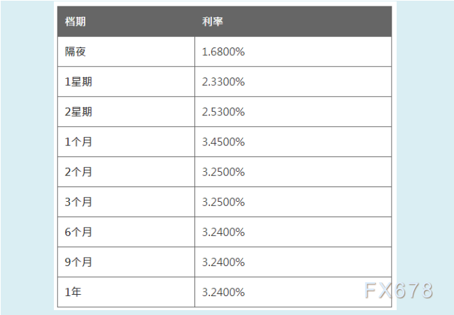 隔夜HIBOR报1.6800%,一周期HIBOR报2.3300%,两周期HIBOR报2.5300%;