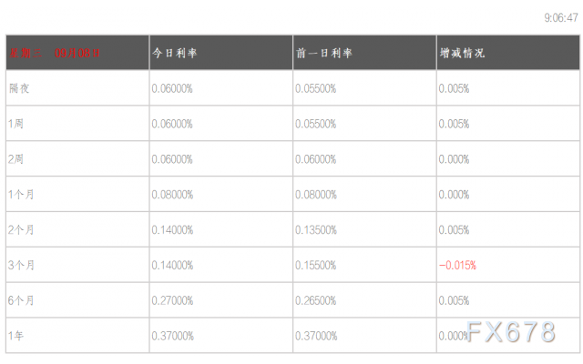 09月08日香港银行间同业拆借利率港币:隔夜报0.06% 1周期报0.06% 1月期报0.08% 3月期报0.14% 6月期报0.27%