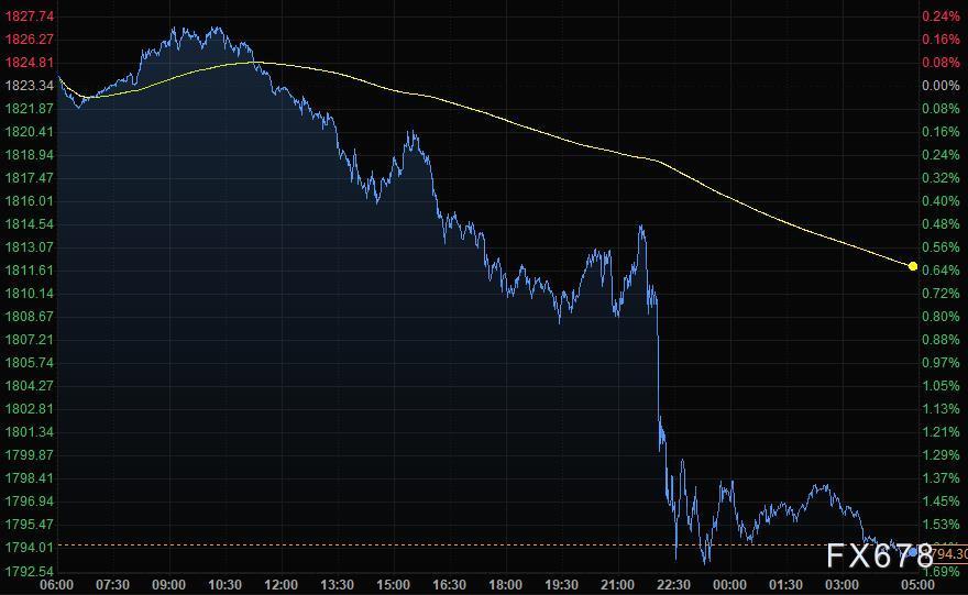 现货黄金周二收跌约1.6%,报1794.30美元/盎司,创下一个月来最大单日跌幅,美元走强和美债收益率上升令黄金失去吸引力。