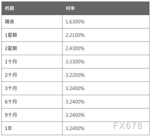 1个月HIBOR报3.3300%,2个月HIBOR报3.2200%,3个月HIBOR报3.2400%。