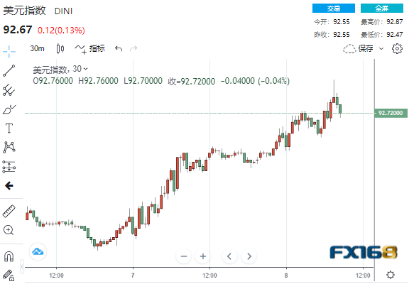 衡量美元兑六种货币汇率的美元指数持续上涨,最高触及92.87,为9月1日以来的最高水平。