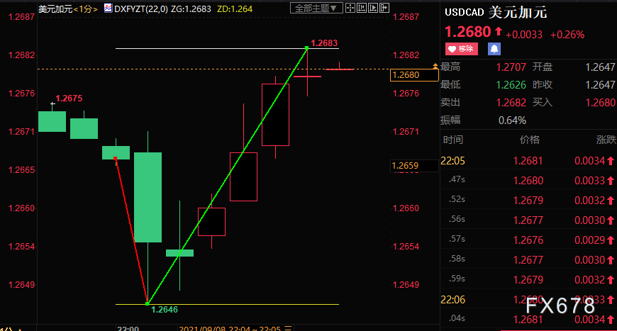 北京时间周三(9月8日)22:00,加拿大央行如期维稳利率0.25%不变,并强调疫情构成风险,但预计下半年经济复苏增强。截至发稿,美元兑加元下探21点后反弹40点至1.2686。