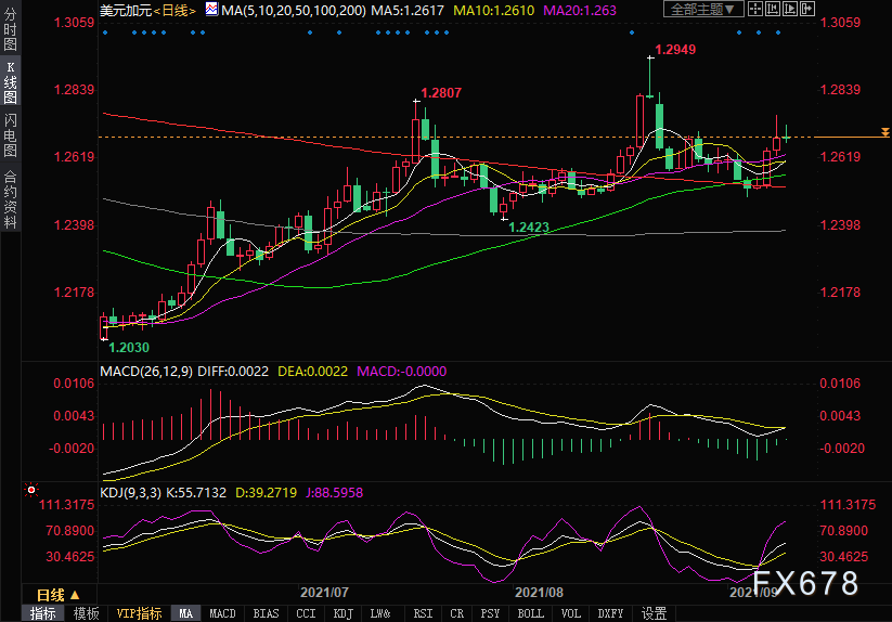 周四(9月9日)美元兑加元冲高回落,目前仍然交投于1.27下方。在本周前两个交易日汇价录得上涨,并在周三达到两周高点1.2763。