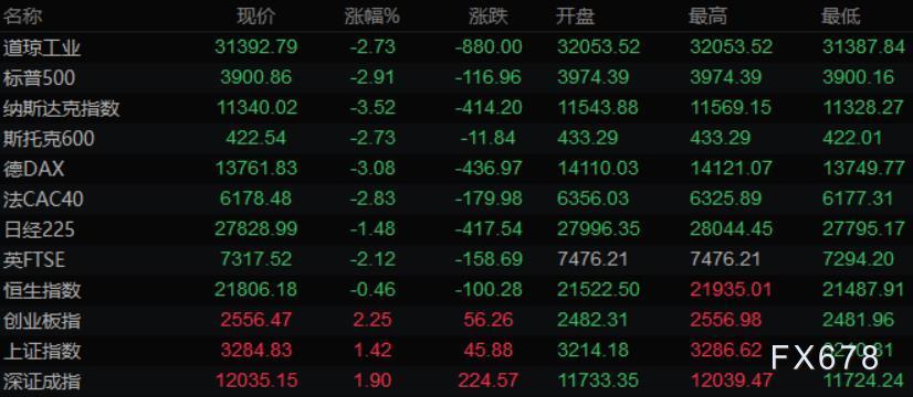美股收盘情况:标普500指数跌2.9%;全周下跌超过5%;道琼斯指数下跌2.7%,全周跌4.6%;纳斯达克综合指数下跌3.5%,全周下跌5.6%;纳斯达克100指数下跌3.6%,全周下跌5.7%;罗素2000指数下跌2.7%,全周跌4.4%。