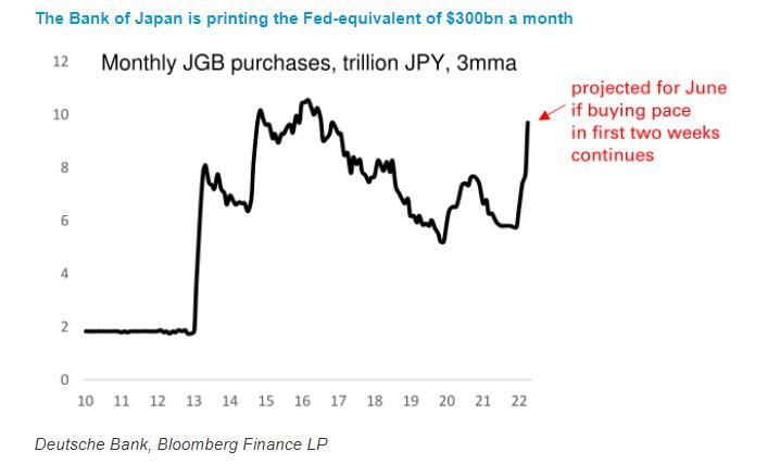 德意志银行的GeorgeSaravelos在一篇题为《印钞机正在超速运转》的帖子中计算出了令人震惊的结果。如果目前的购买速度持续下去,日本央行在6月份可能要购买大约10万亿日元国债。这要是放在美国,大致相当于美联储每月执行超过3000亿美元的量化宽松政策!
