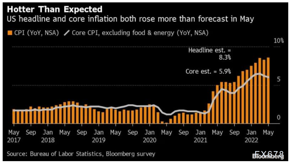 美国劳工部上周五发布的报告显示,5月份美国消费者价格同比上涨8.6%,远超预期的同时进一步刷新了40年来的最高纪录,这一数据也彻底打破了白宫有关决策者管住了美国人生活成本飙升的说法。不含食品和能源的核心消费者价格同比上涨6%,环比上涨0.6%,同样高于预期。