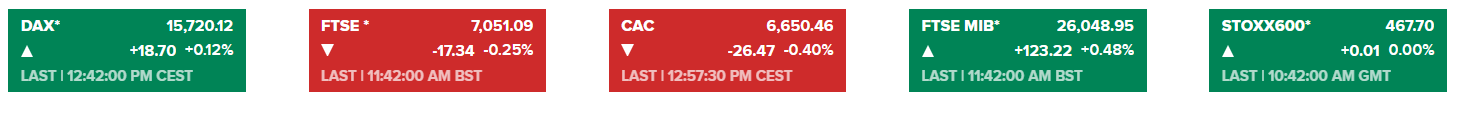 欧美股市:针对欧洲股市,Yahoo finance报道指出,在伦敦,受矿业和银行类股拖累,富时100指数开盘后下跌0.5%,而法国CAC指数下跌0.2%,法兰克福DAX指数持平。截至发稿,欧洲股市主要股指走势如图: