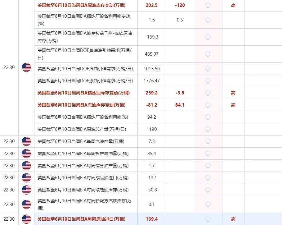 22:30 美国截至6月10日当周EIA原油库存变动(万桶) , 前值 202.5 , 预期值 -120 , 公布值:待发布