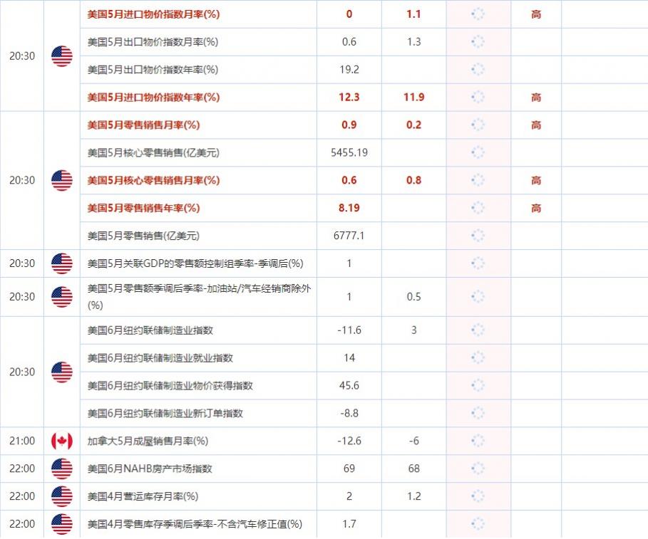 20:30 美国5月零售销售年率(%) , 前值 8.19 , 预期值 -- , 公布值:待发布