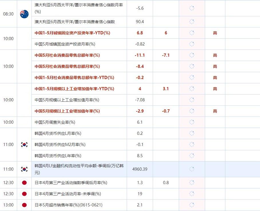 10:00 中国5月社会消费品零售总额月率(%) , 前值 -8.4 , 预期值 -- , 公布值:待发布