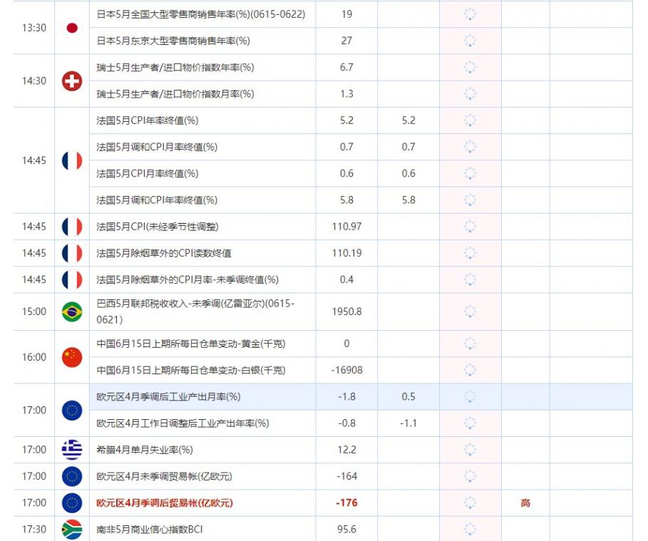 14:45 法国5月调和CPI年率终值(%) , 前值 5.8 , 预期值 5.8 , 公布值:待发布