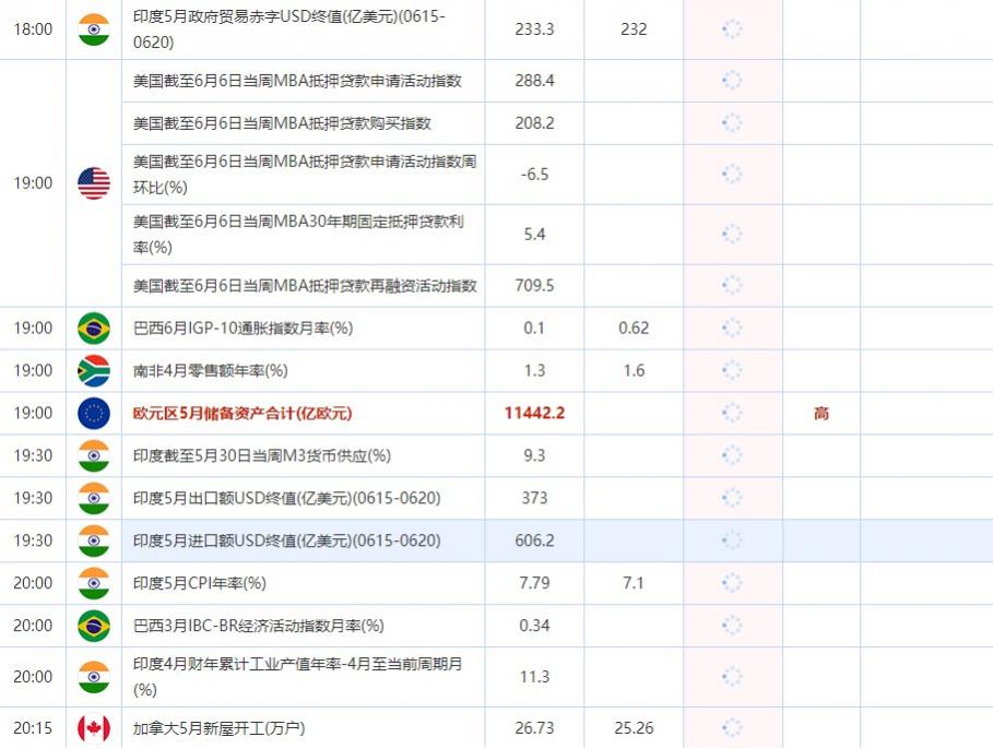 19:00 美国截至6月6日当周MBA30年期固定抵押贷款利率(%) , 前值 5.4 , 预期值 -- , 公布值:待发布