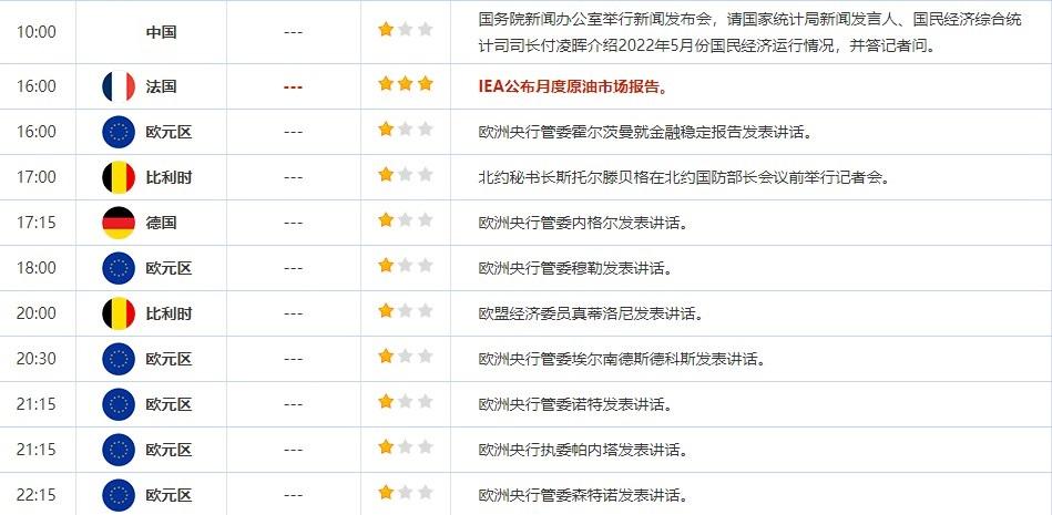 2022年6月15日,全球主要经济体将公布经济数据,需重点关注 美国截至6月6日当周API原油库存变动,欧元区4月季调后贸易帐,美国5月零售销售月率,美国截至6月10日当周EIA原油库存变动。当天投资者需关注IEA公布月度原油市场报告。此外,美联储将于北京时间6月16日02:00发布利率决议,投资者也需保持关注。