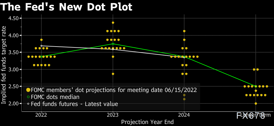 根据点阵图,官员们预测今年年末基准利率将升至3.4%,意味着今年还需要加息175基点。他们的预测中值是利率中值在2023年将达到3.8%这一峰值,五位官员预计该利率将超过4%; 3月的预测中值是今年联邦基金利率升至1.9%,明年达到2.8%。在利率声明公布前,期货市场交易员押注的峰值利率约为4%。