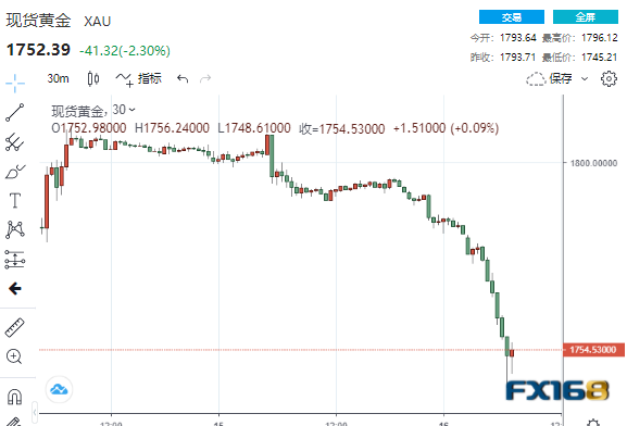 随着美元回升,现货黄金遭遇猛烈抛售,跌破1750美元/盎司关口,较日高回落近51美元,日内跌幅扩大至约2.5%。 现货白银日内大跌5%,现报22.62美元/盎司,为8月9日来新低。
