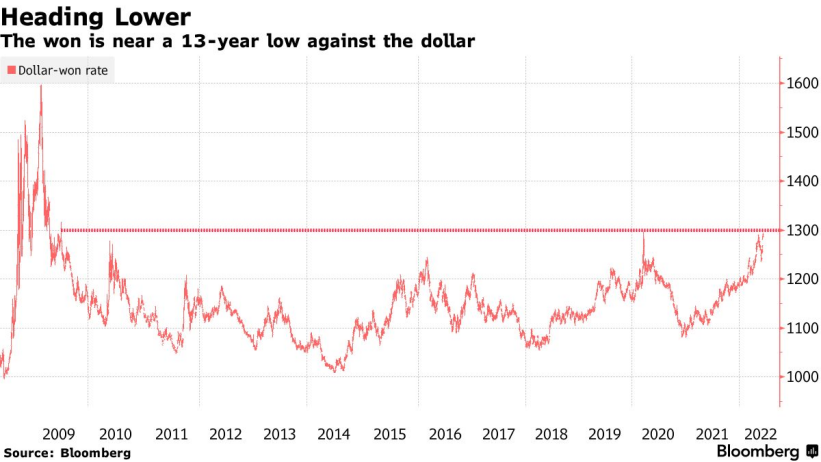 今年以来,作为风险敏感的货币,韩元深受全球经济增长担忧的打击。韩元兑美元汇率已下跌约8%,落后于所有亚洲新兴货币。