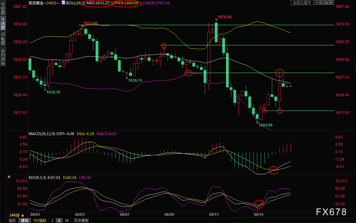 4小时级别:震荡下跌后反弹;MACD金叉,KDJ金叉,短线略微偏向多头,目前正试探布林线中轨附近阻力,大约在1833附近,一旦顶破该阻力,则增加短线看涨信号,进一步阻力在隔夜高点1841.70关口附近,然后是1859.50附近阻力。当然,1850关口也可以稍微留意一下。
