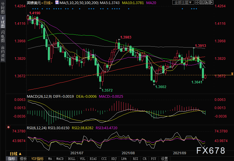 下方支撑位关注9月20日低位1.3641,进一步关注8月20日低位1.3602以及7月20日低位1.3572。
