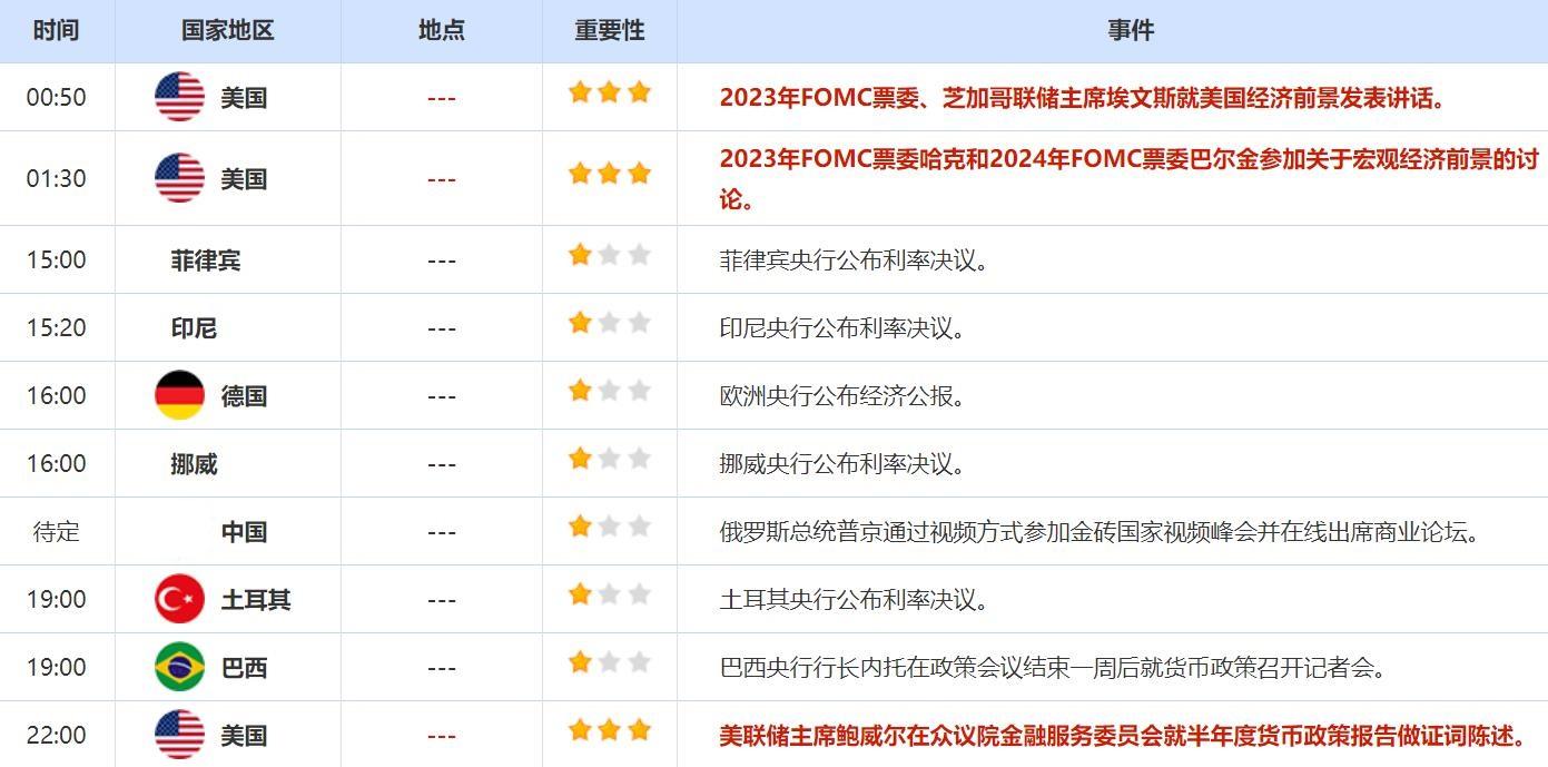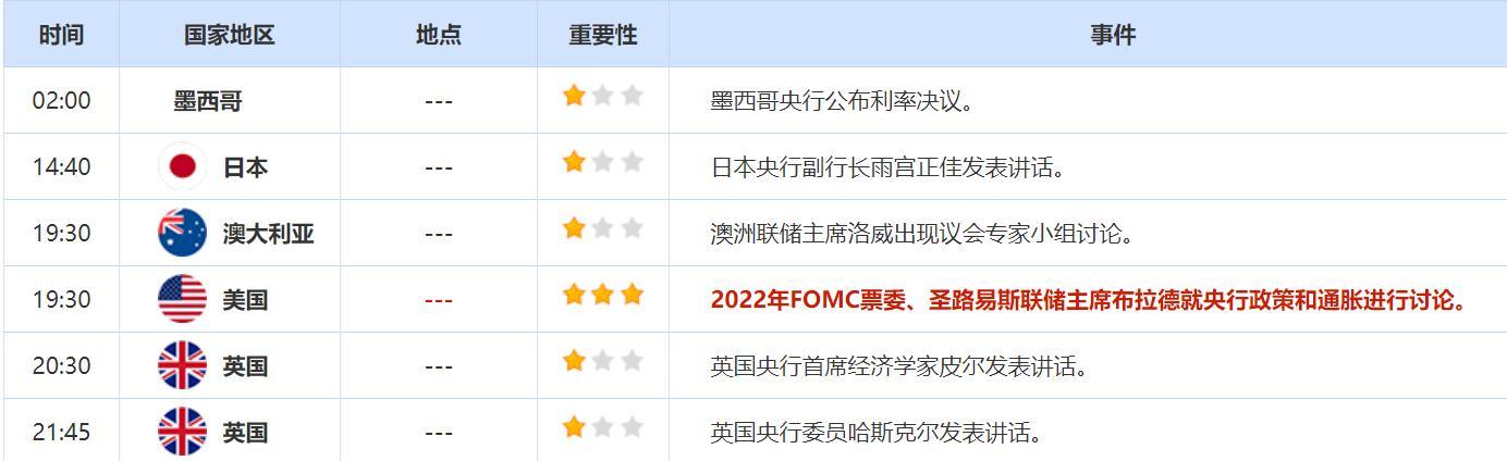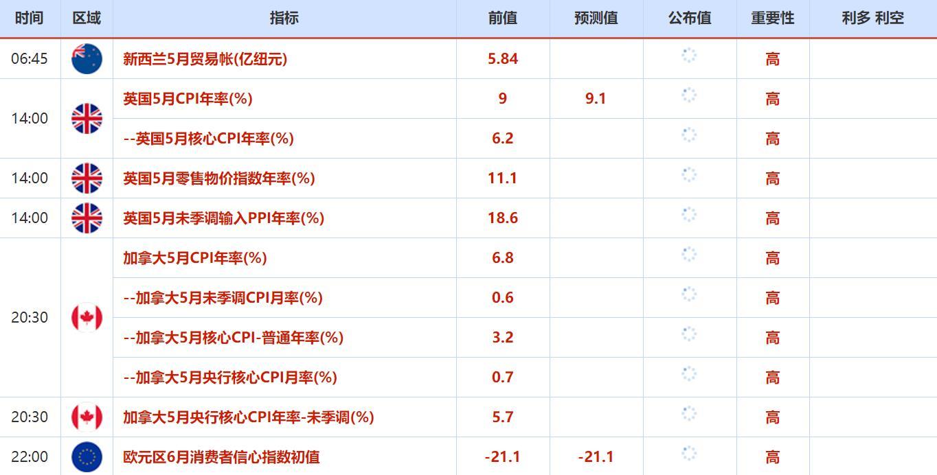 6月22日(周三)关键字:英国5月CPI,克利夫兰联储主席梅斯特