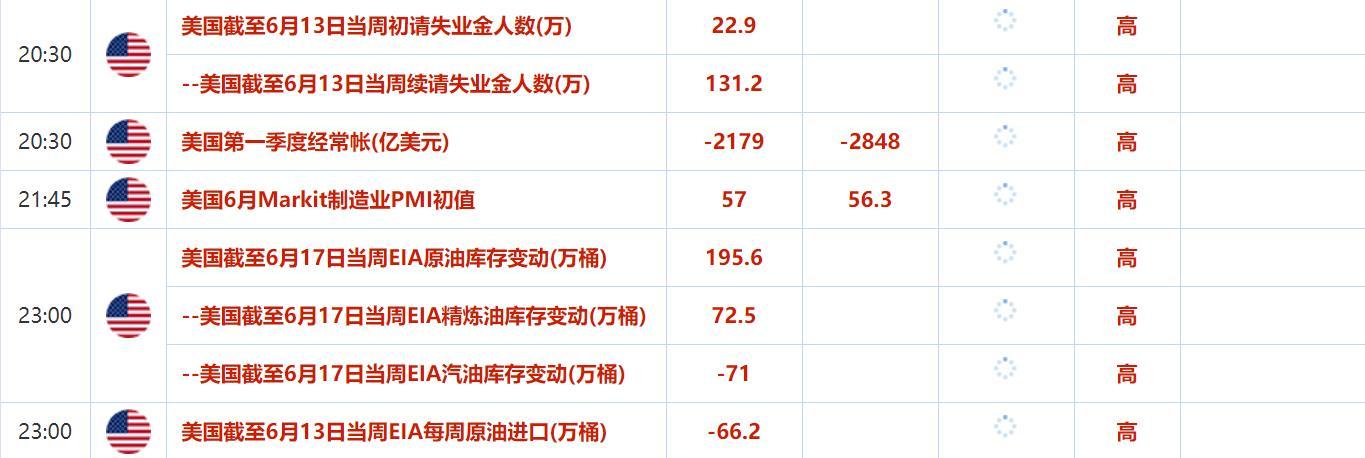 6月23日(周四)关键字:美国截至6月13日当周API原油库存变动,欧元区多国Markit制造业PMI初值,美国截至6月13日当周初请失业金人数,美国截至6月13日当周EIA原油库存变动