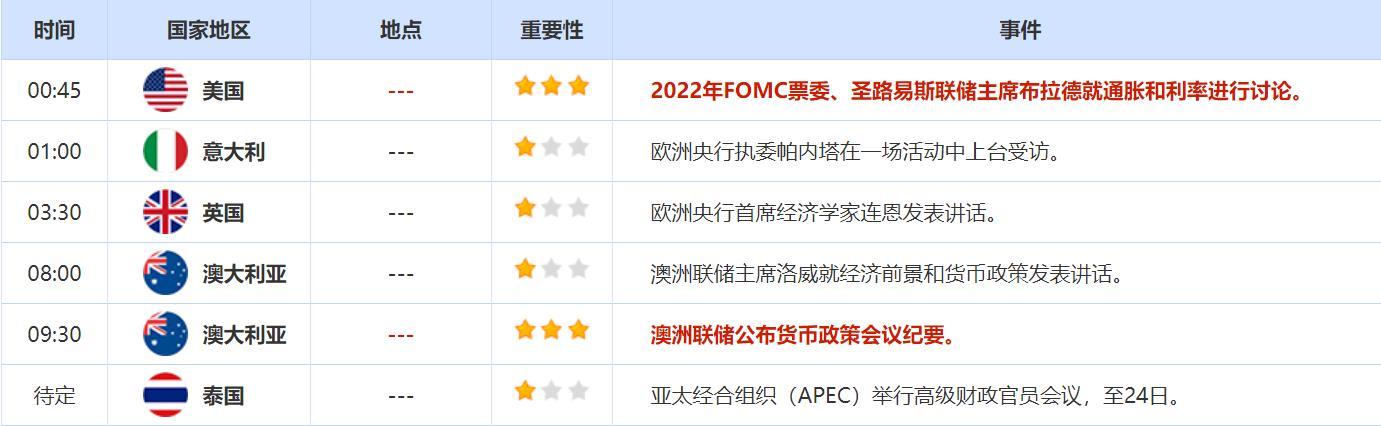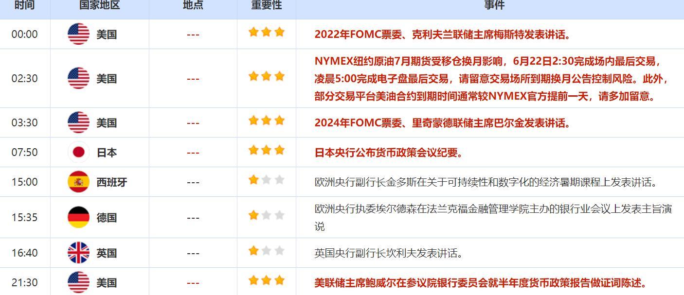 投资者需要关注的6月22日大事包括克利夫兰联储主席梅斯特讲话,以及日本央行货币政策会议纪要。