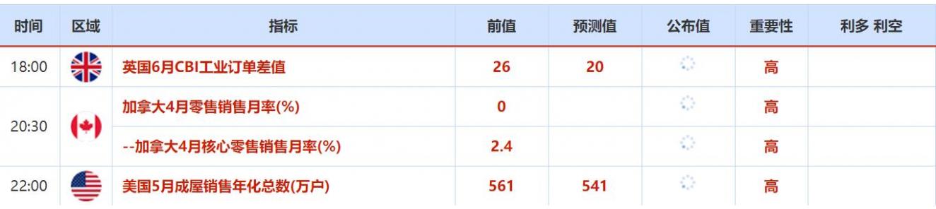 6月21日(周二)关键字:英国6月CBI零售销售差值,美国5月成屋销售年化总数