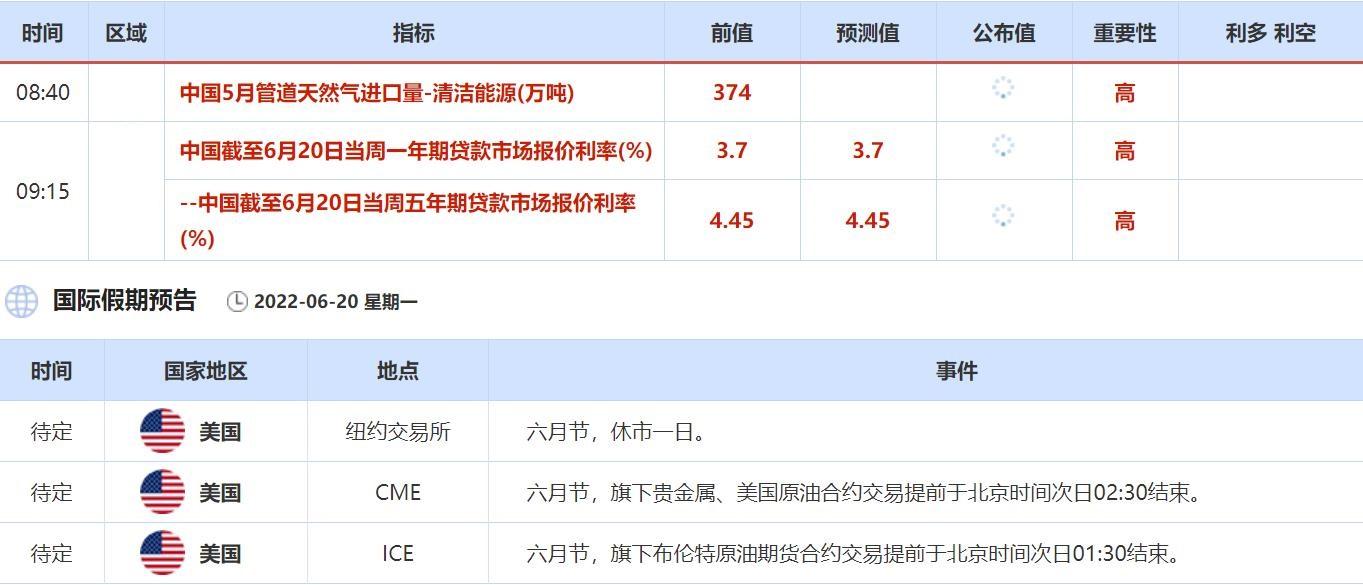 6月20日至6月24日当周,投资者需要关注的重点数据包括英国6月CBI零售销售差值,英国5月CPI,美国截至6月13日当周API和EIA原油库存变动,欧元区多国Markit制造业PMI初值,美国截至6月13日当周初请失业金人数,以及日本5月全国CPI年率。当周还需要关注澳洲联储主席洛威,克利夫兰联储主席梅斯特,芝加哥联储主席埃文斯,美联储主席鲍威尔等人的讲话。此外,澳洲联储和日本央行将公布货币政策会议纪要,也是当周需要关注的焦点。