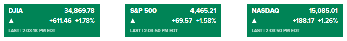 美市盘中,道琼斯指数上涨逾600点,涨幅达近1.8%。标普500指数上涨近1.6%,纳斯达克综合指数上涨1.2%。