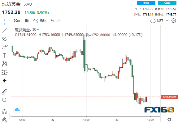 欧美时段盘中,现货黄金持续下跌,接连下破1770、1760和1750美元三道关口,最低触及1745.77美元/盎司,较日高跌去超30美元。