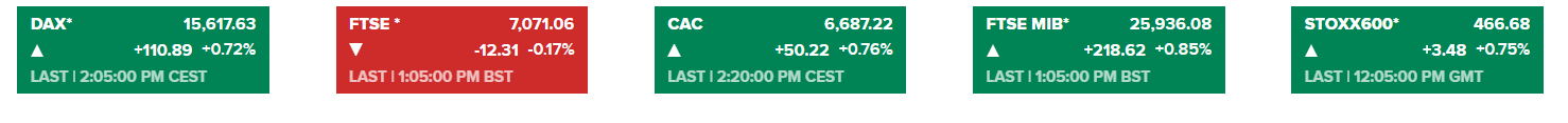 欧美股市:欧洲股市周四开盘走高,在伦敦,富时100指数开盘后上涨0.4%,而在法兰克福,法国CAC指数上涨0.6%,DAX指数上涨0.7%。截至发稿,欧洲股市主要股指走势如图: