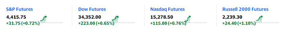 美股期货方面,在华尔街,标准普尔500指数期货上涨0.4%,道琼斯指数期货上涨0.5%,纳斯达克期货上涨0.3%。截至发稿,美股期货走势如图:
