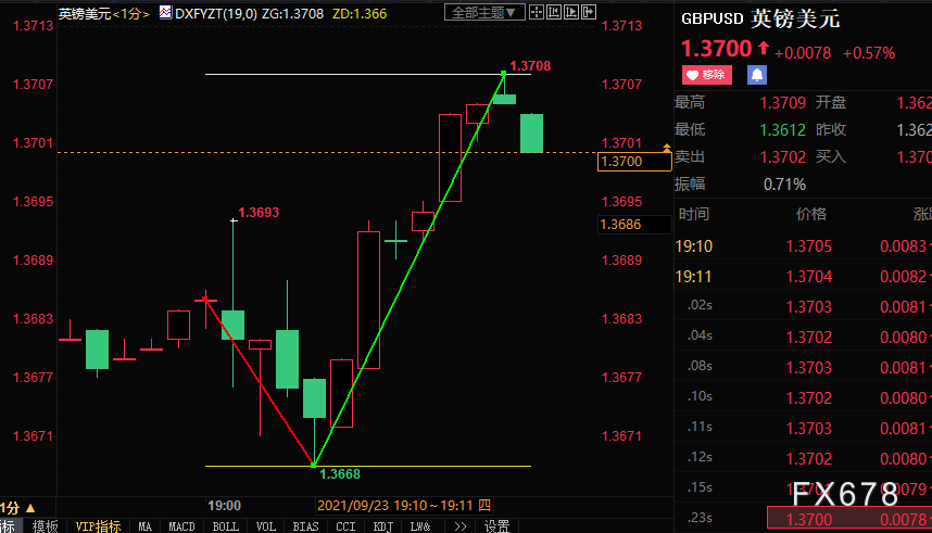 北京时间周四(9月23日)19点,英国央行公布新一期利率决议,维持现行政策不变,但英银预计CPI将进一步上升,货币市场将英国央行加息15个基点的押注提前至2022年3月(此前为2022年5月)。截至发稿,英镑兑美元累计上涨23点至1.3708,波动幅度达到40点。