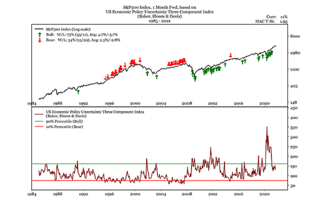 德格拉夫指出,标普500指数尚未升到前十分位(见图表底部),这通常是标普500指数远期回报的看涨信号。