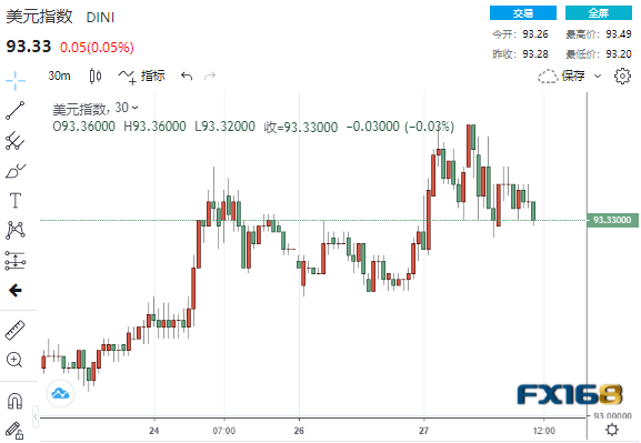 美市盘中,衡量美元兑六种主要货币的美元指数上涨0.05%,至93.33,稍早触及93.49高点。