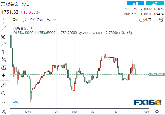 美市盘中,现货金交投于平盘附近,现徘徊于1751.33美元一线。