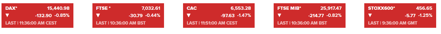 从欧洲故股市主要股指方面来看,欧洲股市走低。截止到当地时间上午10点,富时100指数下跌0.4%,德国DAX指数下跌0.9%,法国CAC指数下跌1.4%。目前,欧洲股市主要股指走势如图所示: