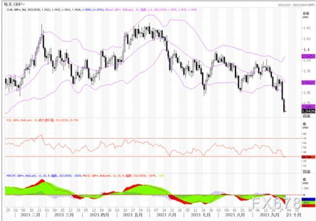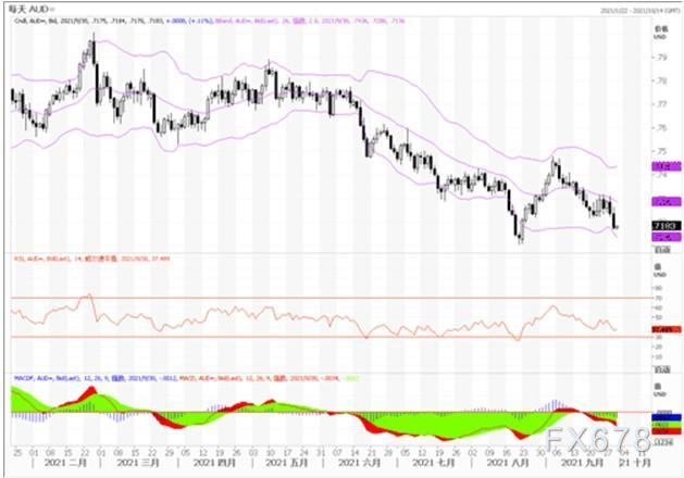 周三,澳元兑美元进一步走软,跌破0.72最低至0.7170。鉴于已经实施了严格的封锁措施,市场活动可能会出人意料地下行。当局在控制最新的COVID爆发方面仍面临挑战,尤其是在新南威尔士州和维多利亚州。第三季度GDP降幅可能超过预期,第四季度增速可能低于预期,这两个因素都可能对澳元构成压力。澳大利亚央行已经将对债券购买速度的下一次评估推迟到2022年2月。如果增长和通胀趋势保持温和,这一日期可能会进一步推迟,这也将抑制澳元。澳大利亚大宗商品价格(以美元计算)8月份下跌了6%。未来几个月还可能出现更大幅度的下跌,大宗商品价格的疲软也可能对澳元构成不利。技术图形上,澳元兑美元下方初步支撑在日线级别布林线下轨0.7183附近,如果进一步下破,则可能跌向8月20日低点0.7106附近。鉴于短线技术指标超卖较重,澳元或会有反弹调整行情,但只要受阻于0.7220上方阻力之下,澳元兑美元跌势难改。