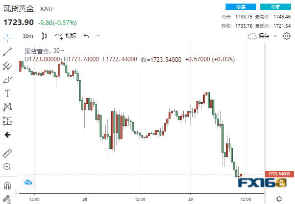 在美元强势攀升之际,现货黄金遭遇抛售潮突袭,最低跌至1721.44美元/盎司,创下8月11日以来新低,较日高跌去近24美元。