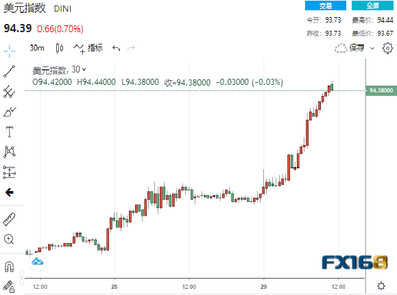美元指数连续第四个交易日上涨,达到94.44高点,为自去年11月初以来的最高水平,日内上涨逾0.7%。