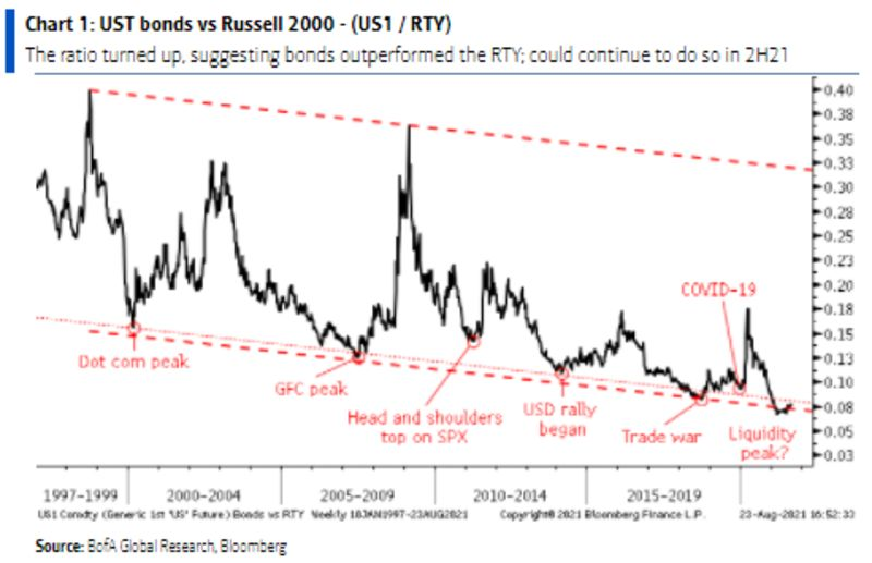 “这种跨资产难题为2021年下半年的风险承担投下了阴影,比率上升表明了向安全资产轮动和/或再平衡的趋势,在支撑因素仍然存在的情况下,这个趋势将会继续。”