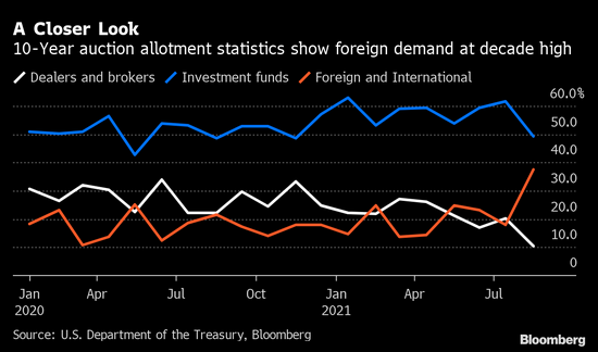 本月10年期美国国债发行的明细结果显示,海外资金的获配金额创下纪录新高。